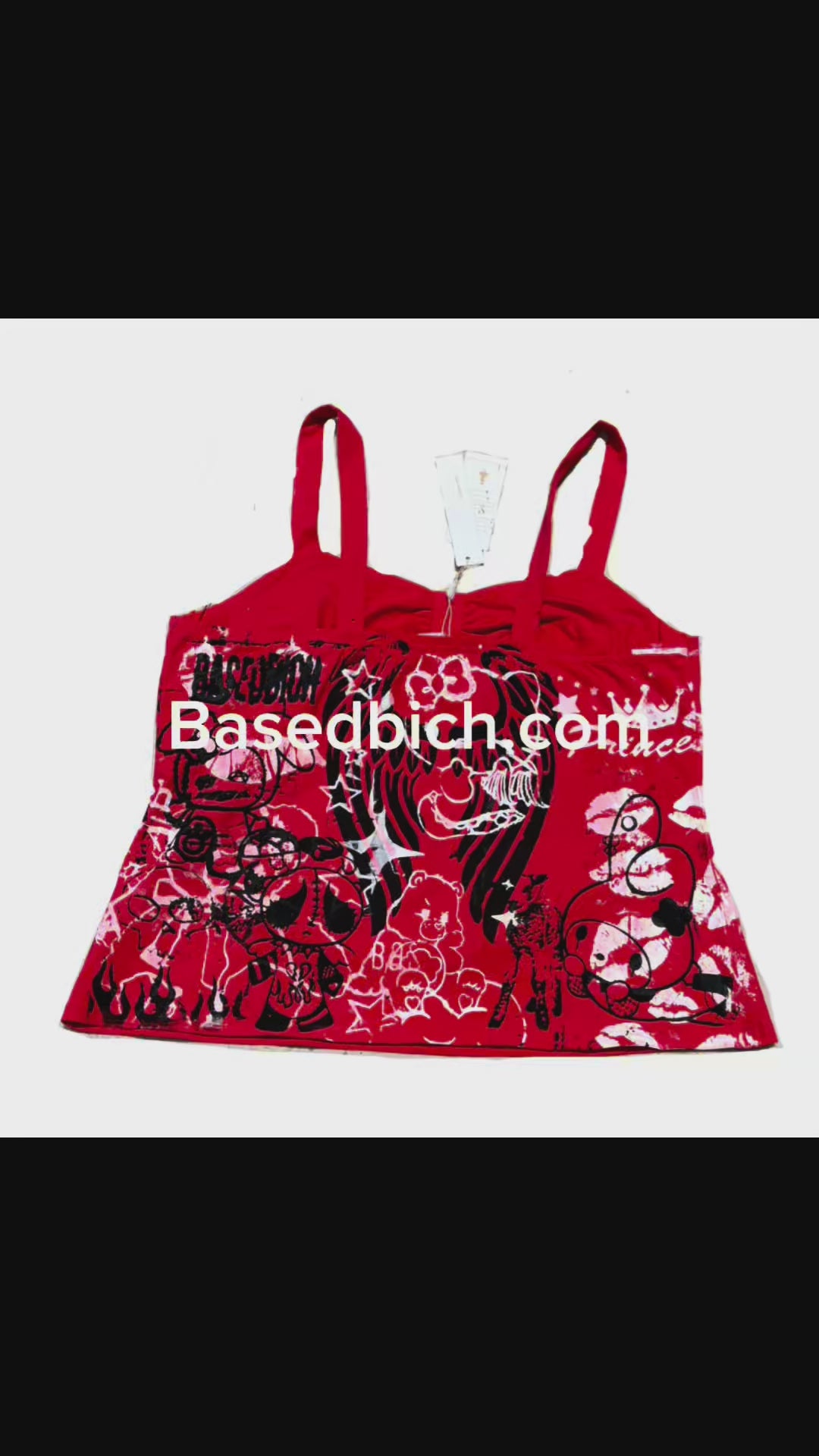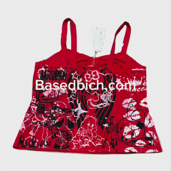 This red-hot retro cami is fully reworked and hand printed with chaotic baddie energy. Custom graphics smashed up with iconic inspo — Powerpuff Girls, skulls, bows, lips, Hello Kitty flips, and your fave nightmare fuel all in one.