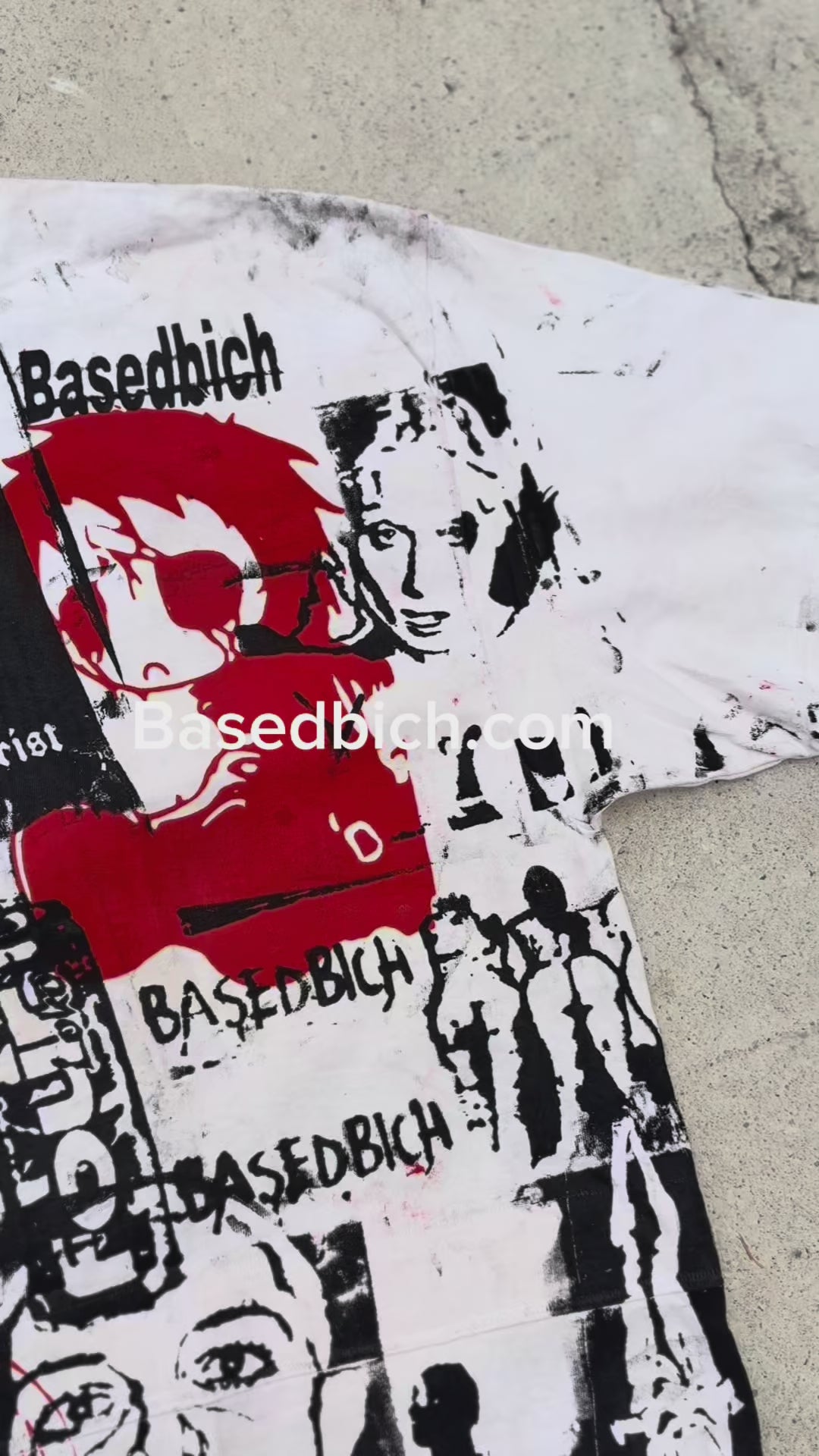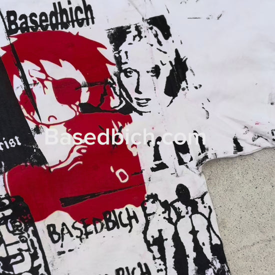 This tee is a full-on handmade chaos piece – front and back go crazy with raw prints, custom cut ‘n sewn fit, and straight-up savage collage work. Blood, sex, death, and Basedbich. Every graphic hits like a punch – Slayer nods, broken icons, devilish bunnies, and TikTok madness stitched into a wearable meltdown.