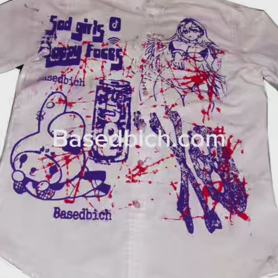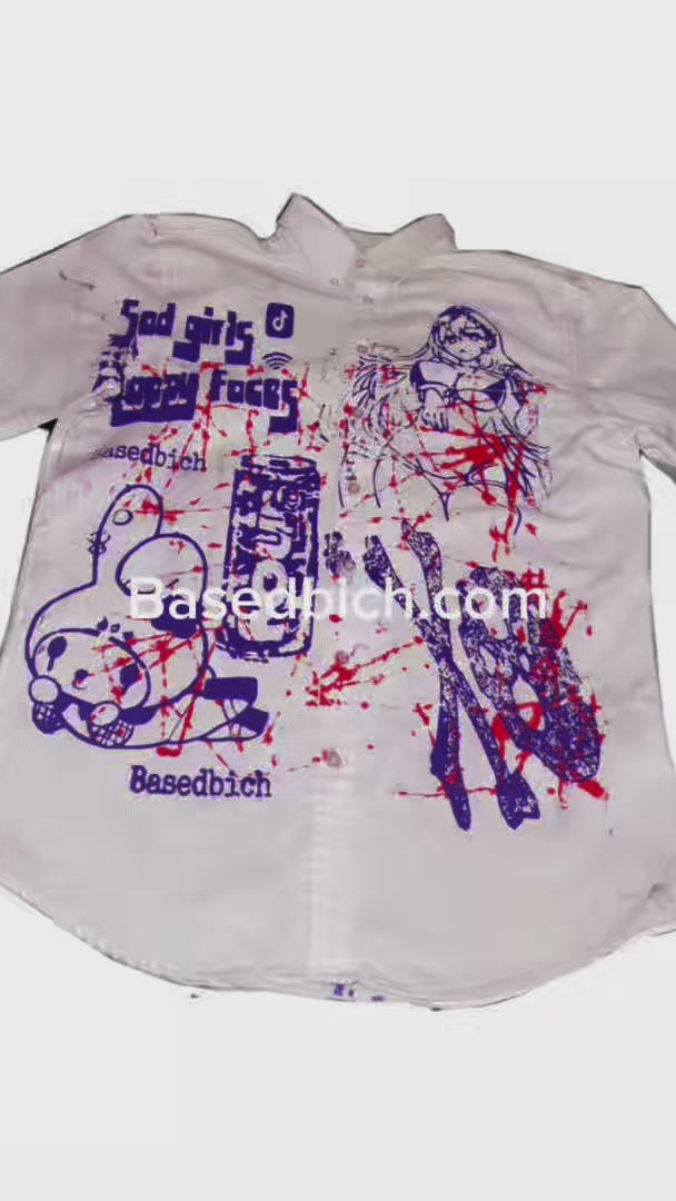 This upcycled men’s button-up got dragged through a Basedbich daydream and came out screaming. Handprinted with glitchy anime visuals, corrupted teddy bears, and raw red splatter, this piece is for anyone who thrives in beautiful chaos.